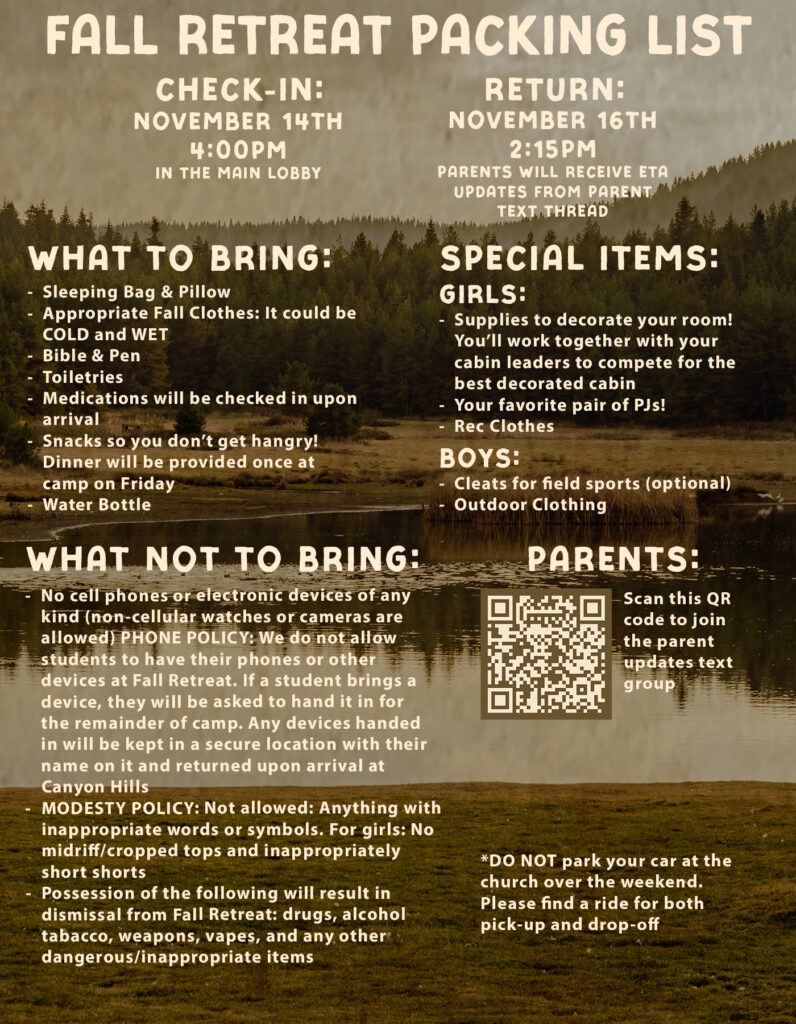 Our goal is to create a space where every student can disconnect from screens and fully engage with God, their community, and the life-changing experience of Fall Retreat.